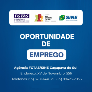 Vagas de emprego Confira as oportunidades desta semana da Agência FGTAS/SINE de Caçapava Crédito: Divulgação A Agência Caçapava, da Fundação Gaúcha do Trabalho e Ação Social e Sistema Nacional de ...